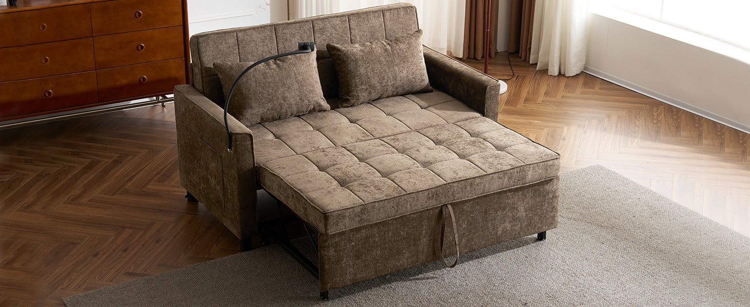 The 56.9" convertible sofa bed seamlessly blends sleek design with exceptional functionality, making it a perfect choice for contemporary interiors. Upholstered in soft chenille, it offers a warm and inviting touch. This sofa bed features two USB ports for convenient device charging, a phone holder to free your hands, a reclining backrest for customized comfort, and handy side pockets for storing essentials. When fully extended, the sofa measures 69.5" in depth, providing ample sleeping space without sacrificing style. Ideal for small apartments or guest rooms, this sofa bed ensures your guests enjoy a restful night's sleep.