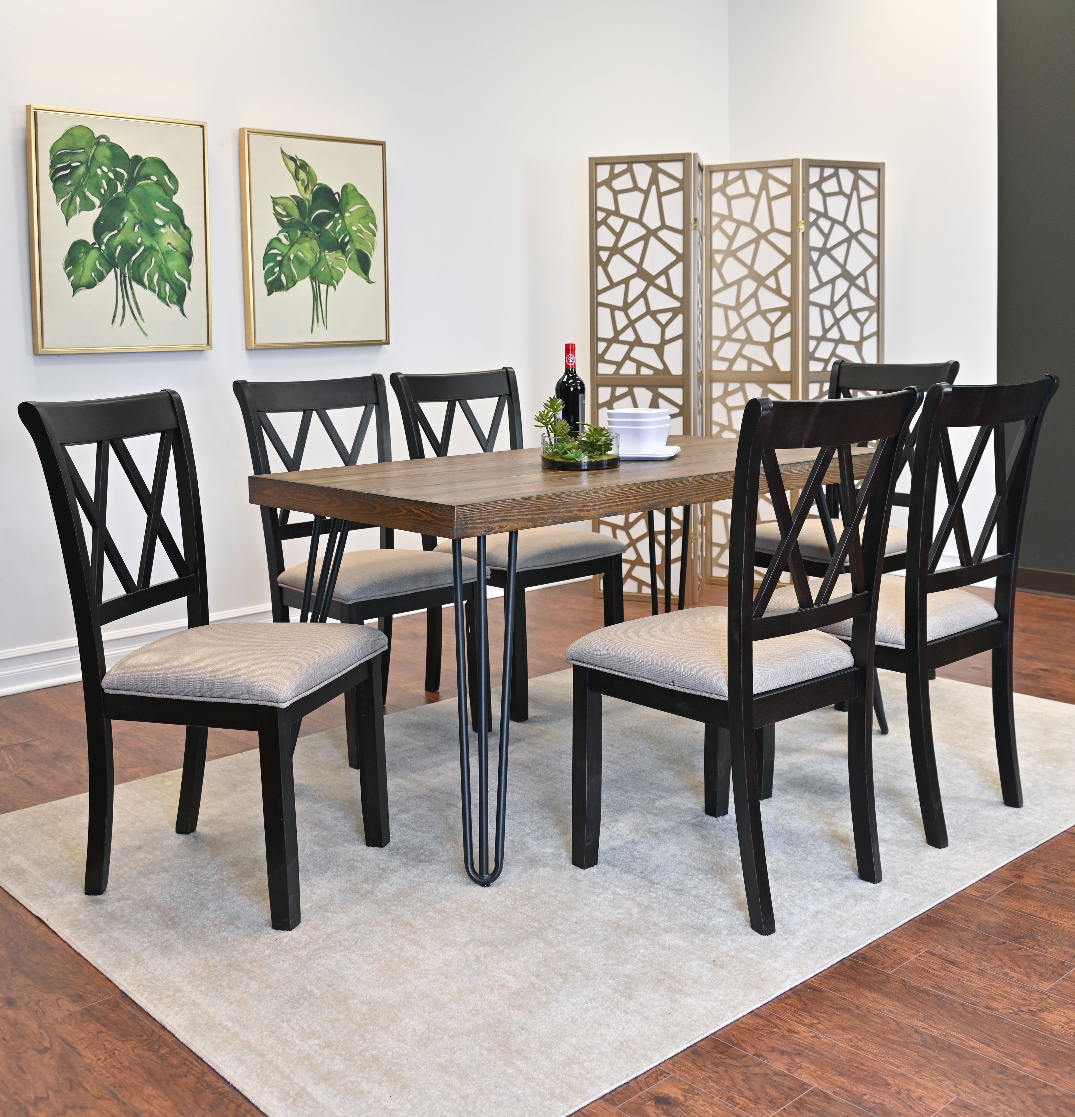 Arroyo 7-Piece Dining Set, Hairpin Dining Table with 6 Cross-back Chairs, Rich BlackUpgrade your dining space with the Arroyo 7-Piece Dining Set . This meticulously crafted dining set combines functionality and elegance, making it the perfect addition to any décor.This stylish set includes a sleek dining table and six cross-back chairs, designed to add a touch of chic modernity to your space. The dining table features a rustic dark pine finish with a metallic hairpin design, showcasing a beautiful wood grain texture that is sure to impress your guests. The tabletop is constructed with durable engineered wood and is well-coated, ensuring long-lasting durability. The cross-back dining chairs, finished in a rich black hue, perfectly complement the table's aesthetic. Built with solid rubberwood, these chairs guarantee long-lasting support. The cushioned seats, adorned with tan linen-look upholstery, offer both elegance and comfort. Experience the perfect blend of style, durability, and comfort with the Arroyo Dining Set.